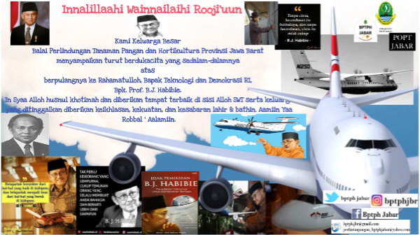 Kami Keluarga Besar Balai Perlindungan Tanaman Pangan dan Hortikultura Provinsi Jawa Barat menyampaikan turut berdukacita yang sedalam-dalamnya atas berpulangnya ke Rahamatulloh, Bapak Teknologi dan Demokrasi RI, Bpk. Prof. B.J. Habibie. In Syaa Alloh husnul khotimah dan diberikan tempat terbaik di sisi Alloh SWT serta keluarga yang ditinggalkan diberikan keikhlasan, kekuatan, dan kesabaran lahir & bathin. Aamiin Yaa Robbal ' Aalamiin.