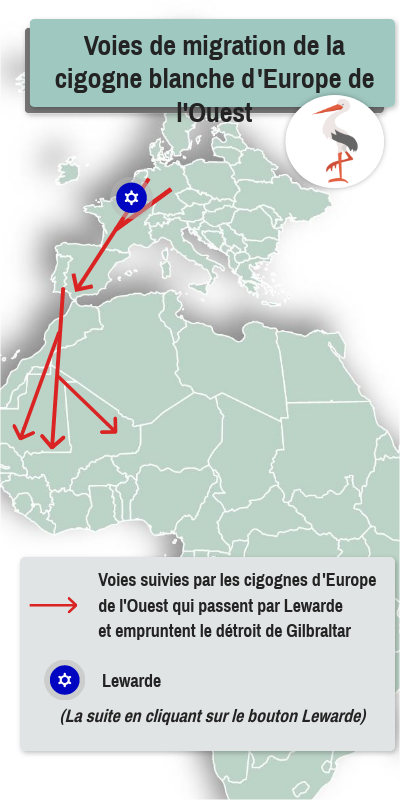 Voies suivies par les cigognes d'Europe de l'Ouest qui passent par Lewarde et empruntent le détroit de Gilbraltar
