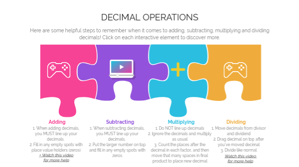 Here are some helpful steps to remember when it comes to adding, subtracting, multiplying and dividing decimals! Click on each interactive element to discover more.