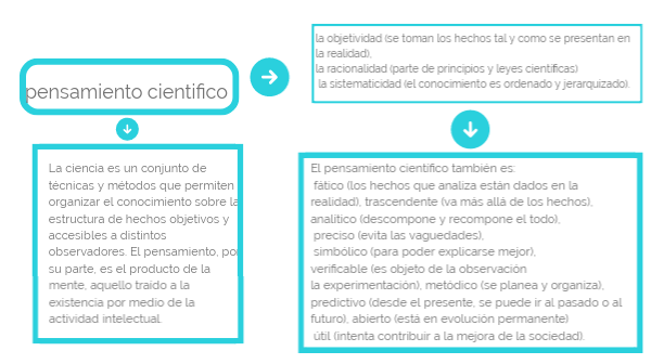 El pensamiento científico también es: fático (los hechos que analiza están dados en la realidad), trascendente (va más allá de los hechos), analítico (descompone y recompone el todo), preciso (evita las vaguedades), simbólico (para poder explicarse mejor), verificable (es objeto de la observación la experimentación), metódico (se planea y organiza), predictivo (desde el presente, se puede ir al pasado o al futuro), abierto (está en evolución permanente) útil (intenta contribuir a la mejora de la sociedad).
