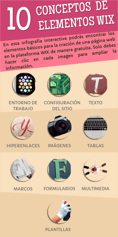 En esta infografía interactiva podrás encontrar los elementos básicos para la cración de una página web en la plataforma WIX de manera gratuita. Solo debes hacer clic en cada imagen para ampliar la información.