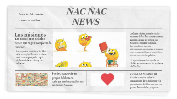 Sin lugar a dudas, cumplir con las misiones de Ñac Ñac supone un reto a superar además del trabajo que tienen que realizar en el aula.Los comelibros han sido seleccionados para ayudar al pequeño monstruo amarillo en el maravilloso arte de construir las palabras.