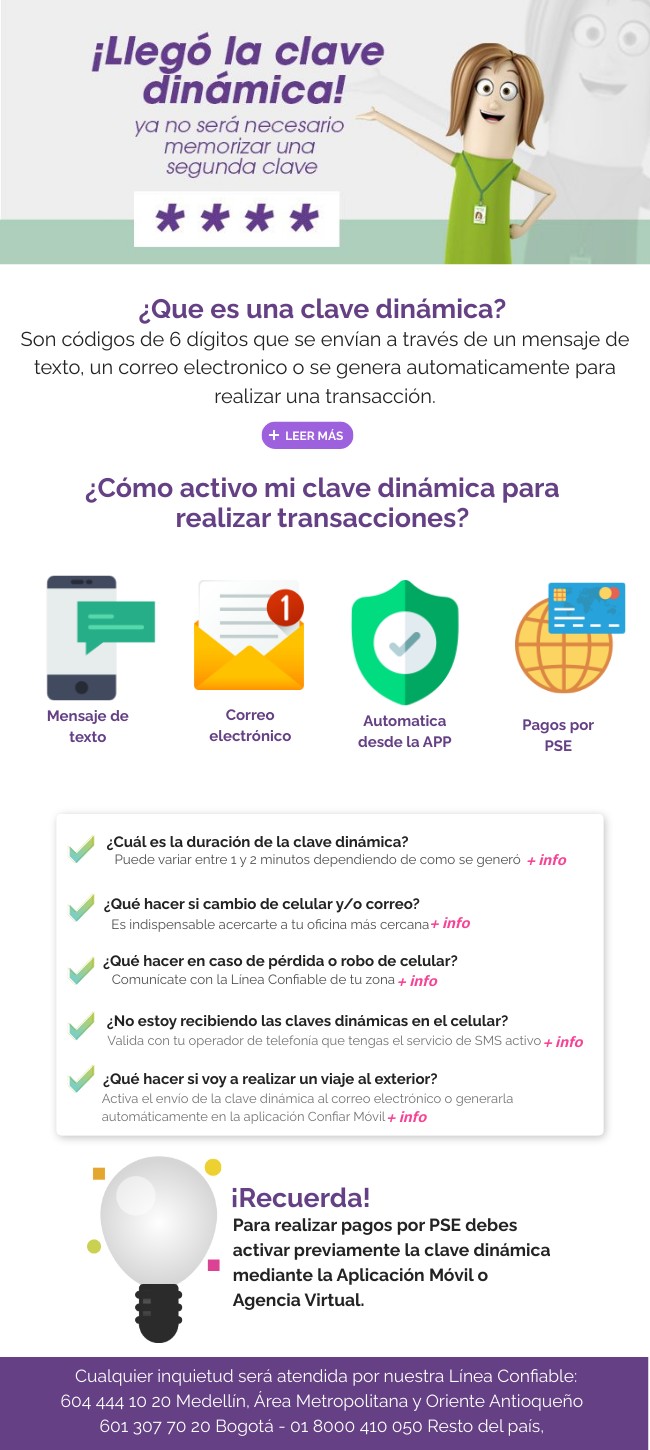 Cualquier inquietud será atendida por nuestra Línea Confiable:604 444 10 20 Medellín, Área Metropolitana y Oriente Antioqueño 601 307 70 20 Bogotá - 01 8000 410 050 Resto del país,