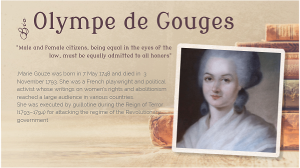 ,Marie Gouze was born in 7 May 1748 and died in 3 November 1793. She was a French playwright and political activist whose writings on women's rights and abolitionism reached a large audience in various countries.She was executed by guillotine during the Reign of Terror (1793–1794) for attacking the regime of the Revolutionary government