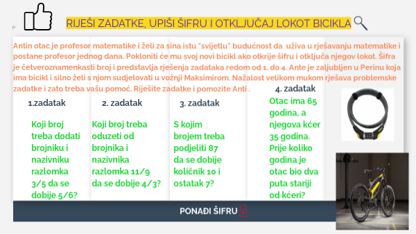 Antin otac je profesor matematike i želi za sina istu "svijetlu" budućnost da uživa u rješavanju matematike i postane profesor jednog dana. Pokloniti će mu svoj novi bicikl ako otkrije šifru i otključa njegov lokot. Šifra je četveroznamenkasti broj i predstavlja rješenja zadataka redom od 1. do 4. Ante je zaljubljen u Perinu koja ima bicikl i silno želi s njom sudjelovati u vožnji Maksimirom. Nažalost velikom mukom rješava problemske zadatke i zato treba vašu pomoć. Riješite zadatke i pomozite Anti .