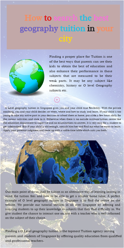 Our main point of focus shall be tuition as an alternative way of learning bearing in mind the tuition fees and how to be able to get a reliable home tutor. A perfect example of O level geography tuition in Singapore is to find the centre on the website. We provide our tutorial services in all over Singapore by offering and assisting students to up their knowledge in subjects that they find difficulty in. We give student the chance to interact one on one with a teacher who is well informed on the subject of their choice.