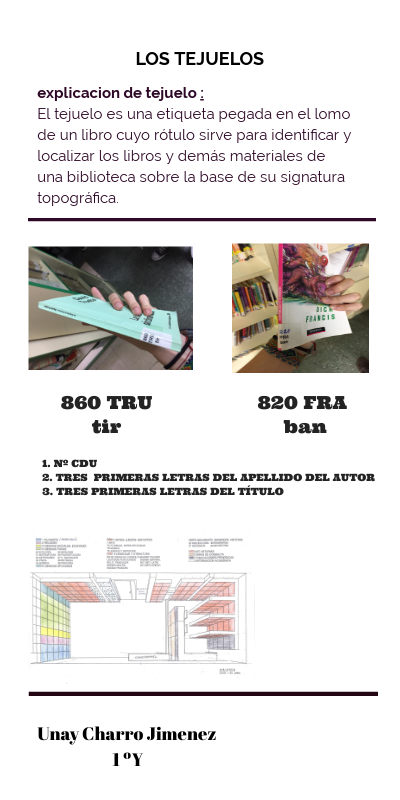 explicacion de tejuelo :El tejuelo es una etiqueta pegada en el lomo de un libro cuyo rótulo sirve para identificar y localizar los libros y demás materiales de una biblioteca sobre la base de su signatura topográfica.