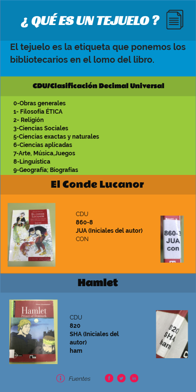 El tejuelo es la etiqueta que ponemos los bibliotecarios en el lomo del libro.