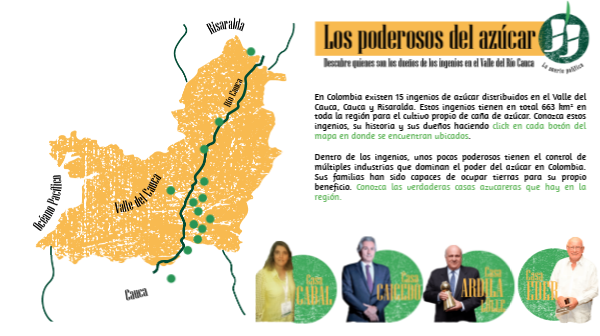 En Colombia existen 15 ingenios de azúcar distribuidos en el Valle del Cauca, Cauca y Risaralda. Estos ingenios tienen en total 663 km² en toda la región para el cultivo propio de caña de azúcar. Conozca estos ingenios, su historia y sus dueños haciendo click en cada botón del mapa en donde se encuentran ubicados. [ ]