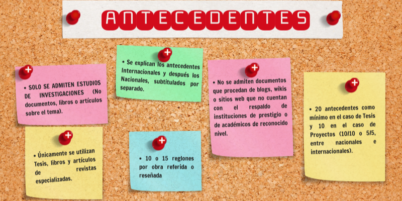 • 20 antecedentes como mínimo en el caso de Tesis y 10 en el caso de Proyectos (10/10 o 5/5, entre nacionales e internacionales).