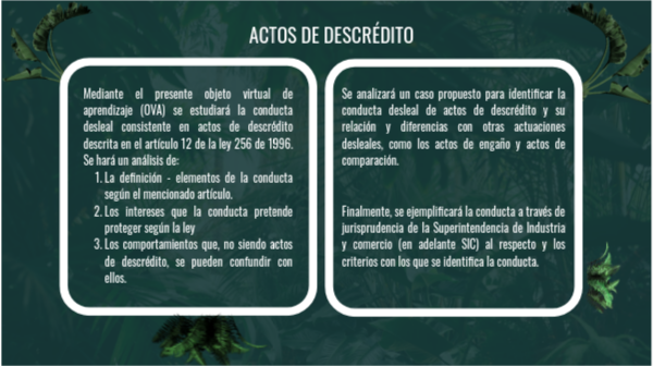 Mediante el presente objeto virtual de aprendizaje (OVA) se estudiará la conducta desleal consistente en actos de descrédito descrita en el artículo 12 de la ley 256 de 1996. Se hará un análisis de:
