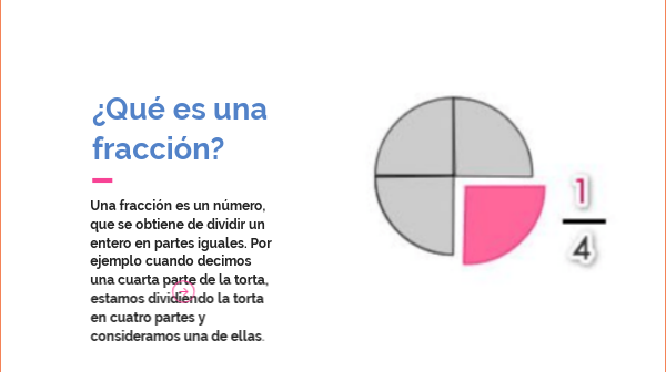 Una fracción es un número, que se obtiene de dividir un entero en partes iguales. Por ejemplo cuando decimos una cuarta parte de la torta, estamos dividiendo la torta en cuatro partes y consideramos una de ellas.