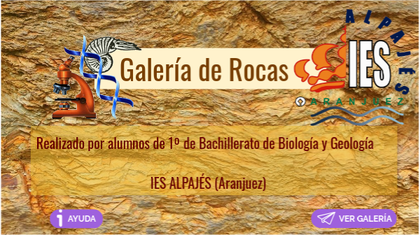 Esta galería interactiva de rocas forma parte de un proyecto de divulgación de la geología que pretende tener continuidad en un futuro ampliando el número de rocas y añadiendo nuevas interactividades a las fichas que lo componen.Ha sido elaborado por alumnos de 1º de Bachillerato Las rocas estan clasificadas alfabéticamente y se puede acceder a ellas a través de la página "índice". En la clave de símbolos de la derecha se explican las funcionalidades de cada uno. Cualquier sugerencia o comentario será bienvenido en el siguiente correo Coordinadores: Javier Alfonso Benito Javier Medina Domínguez