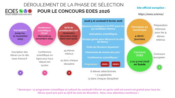 Jeudi 5 et vendredi 6 février 2026Epreuves pratiques à la FST pour les 45 candidats retenusAnimations scientifiques Escape game pour découvrir la ville de Nancy * Visite du Muséum Aquarium * Cérémonie de remise des prix * Conférences scientifiques *