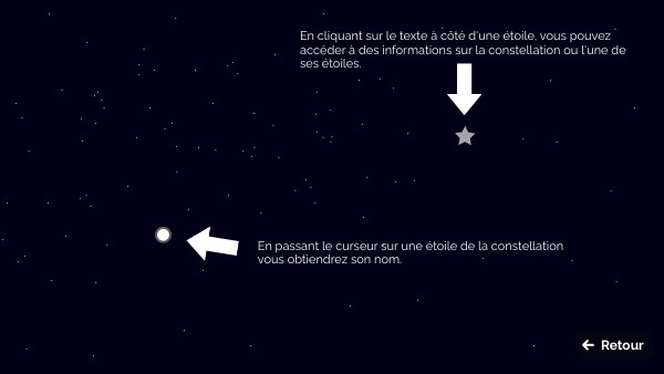 En cliquant sur le texte à côté d'une étoile, vous pouvez accéder à des informations sur la constellation ou l'une de ses étoiles.
