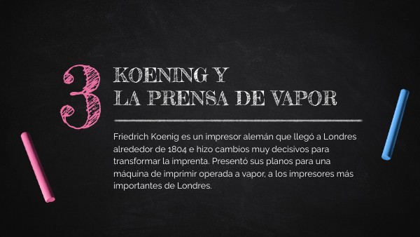 Friedrich Koenig es un impresor alemán que llegó a Londres alrededor de 1804 e hizo cambios muy decisivos para transformar la imprenta. Presentó sus planos para una máquina de imprimir operada a vapor, a los impresores más importantes de Londres.