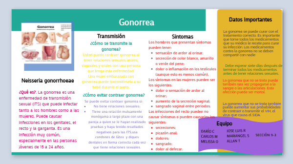 ¿Qué es?. La gonorrea es una enfermedad de transmisión sexual (ITS) que puede infectar tanto a los hombres como a las mujeres. Puede causar infecciones en los genitales, el recto y la garganta. Es una infección muy común, especialmente en las personas jóvenes de 15 a 24 años.