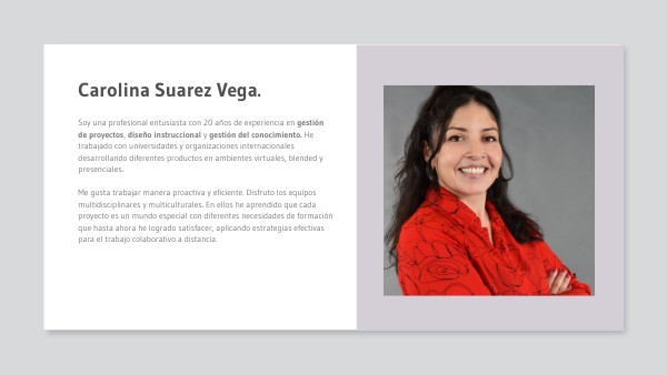 Soy una profesional entusiasta con 20 años de experiencia en gestión de proyectos, diseño instruccional y gestión del conocimiento. He trabajado con universidades y organizaciones internacionales desarrollando diferentes productos en ambientes virtuales, blended y presenciales. Me gusta trabajar manera proactiva y eficiente. Disfruto los equipos multidisciplinares y multiculturales. En ellos he aprendido que cada proyecto es un mundo especial con diferentes necesidades de formación que hasta ahora he logrado satisfacer, aplicando estrategias efectivas para el trabajo colaborativo a distancia.
