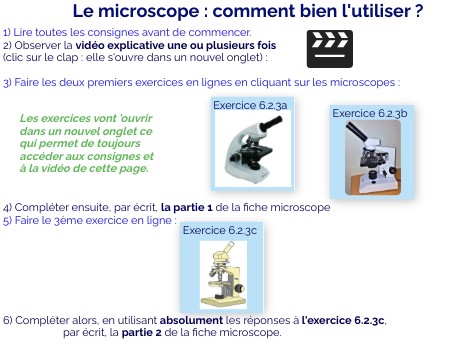 1) Lire toutes les consignes avant de commencer.2) Observer la vidéo explicative une ou plusieurs fois (clic sur le clap : elle s'ouvre dans un nouvel onglet) : 3) Faire les deux premiers exercices en lignes en cliquant sur les microscopes : 4) Compléter ensuite, par écrit, la partie 1 de la fiche microscope 5) Faire le 3ème exercice en ligne : 6) Compléter alors, en utilisant absolument les réponses à l'exercice 6.2.3c, par écrit, la partie 2 de la fiche microscope.