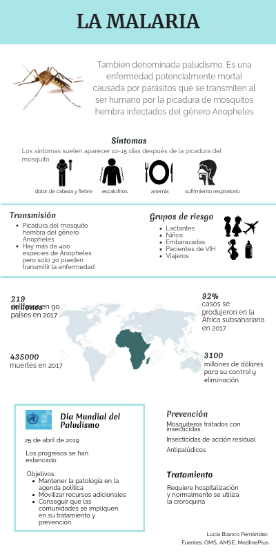También denominada paludismo. Es una enfermedad potencialmente mortal causada por parásitos que se transmiten al ser humano por la picadura de mosquitos hembra infectados del género Anopheles