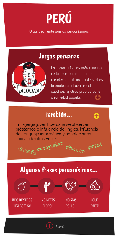 En la jerga juvenil peruana se observan préstamos o influencia del inglés, influencia del lenguaje informático y adaptaciones léxicas de otras voces.
