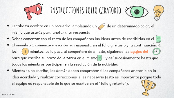 - El miembro 1 comienza a escribir su respuesta en el folio giratorio y, a continuación, a los minutos, se lo pasa al compañero de al lado, siguiendo las agujas del para que escriba su parte de la tarea en el mismo ; y así sucesivamente hasta que todos los miembros participen en la resolución de la actividad.