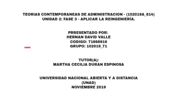 TEORIAS CONTEMPORANEAS DE ADMINISTRACION - (102019A_614) UNIDAD 2: FASE 3 - APLICAR LA REINGENIERÍA. PRRESENTADO POR: HERNAN DAVID VALLE CODIGO: 71668916 GRUPO: 102019_71 TUTOR(A): MARTHA CECILIA DURAN ESPINOSA UNIVERSIDAD NACIONAL ABIERTA Y A DISTANCIA (UNAD) NOVIEMBRE 2019
