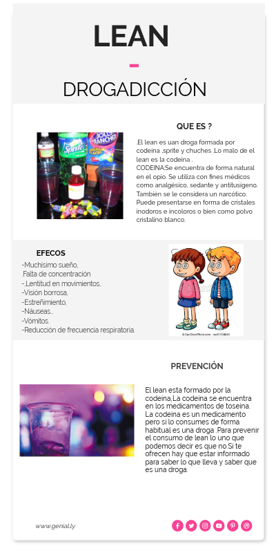 El lean esta formado por la codeina,La codeina se encuentra en los medicamentos de toseina.La codeina es un medicamento pero si lo consumes de forma habitual es una droga .Para prevenir el consumo de lean lo uno que podemos decir es que no.Si te ofrecen hay que estar informado para saber lo que lleva y saber que es una droga.