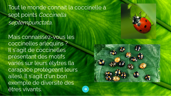 Mais connaissez-vous les coccinelles arlequins ? Il s'agit de coccinelles présentant des motifs variés sur leurs élytres (la carapace protégeant leurs ailes). Il s'agit d'un bon exemple de diversité des êtres vivants.