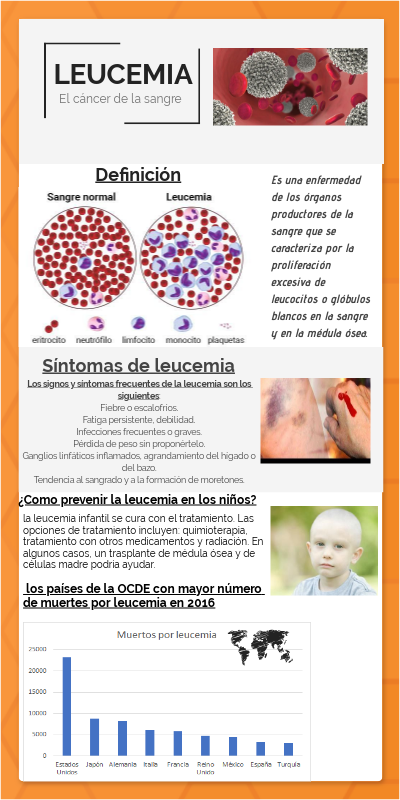 Es una enfermedad de los órganos productores de la sangre que se caracteriza por la proliferación excesiva de leucocitos o glóbulos blancos en la sangre y en la médula ósea.