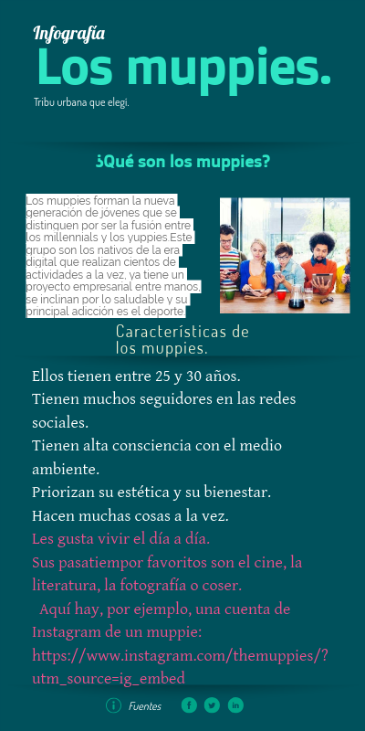 Los muppies forman la nueva generación de jóvenes que se distinguen por ser la fusión entre los millennials y los yuppies.Este grupo son los nativos de la era digital que realizan cientos de actividades a la vez, ya tiene un proyecto empresarial entre manos, se inclinan por lo saludable y su principal adicción es el deporte.