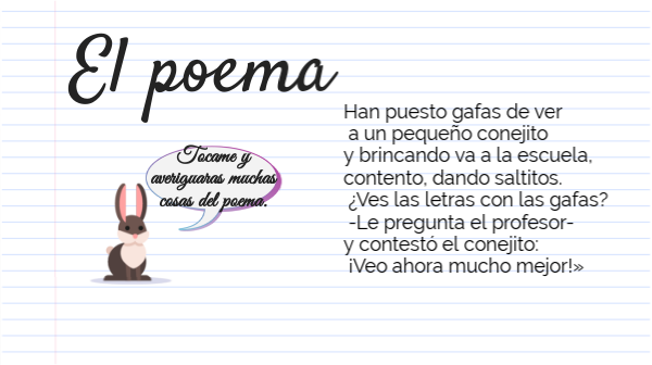 Han puesto gafas de ver a un pequeño conejito y brincando va a la escuela, contento, dando saltitos. ¿Ves las letras con las gafas? -Le pregunta el profesor- y contestó el conejito: ¡Veo ahora mucho mejor!»
