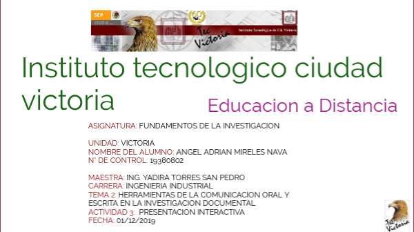 ASIGNATURA: FUNDAMENTOS DE LA INVESTIGACION UNIDAD: VICTORIA NOMBRE DEL ALUMNO: ANGEL ADRIAN MIRELES NAVA N° DE CONTROL: 19380802 MAESTRA: ING. YADIRA TORRES SAN PEDRO CARRERA: INGENIERIA INDUSTRIAL TEMA 2: HERRAMIENTAS DE LA COMUNICACION ORAL Y ESCRITA EN LA INVESTIGACION DOCUMENTAL ACTIVIDAD 3: PRESENTACION INTERACTIVA FECHA: 01/12/2019
