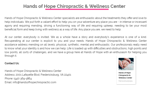 Hands of Hope Chiropractic & Wellness Center specialists are enthusiastic about the treatments they offer and love to help individuals. We put forth a valiant effort to help you on your adventure any place you are - in intense or incessant agony and requiring mending, driving a functioning way of life and requiring upkeep, needing to be your most beneficial form and keep living with wellness as a way of life. Any place you are, we need to help. At our center, everybody is invited. We as a whole have a story and everybody's experience is one of a kind. Recuperating at our center is explicit to you and your needs. Hands of Hope Chiropractic & Wellness Center assistance address mending on all levels: physical, synthetic, mental and enthusiastic. Our professionals really need to know what your identity is and how we can help. Life is loaded up with difficulties and obstructions, high points and low points, all sorts of challenges, and we have a group here at Hands of Hope with an enthusiasm for helping you through it.Contact Us: Hands of Hope Chiropractic & Wellness CenterAddress: 2001 Lafayette Blvd, Fredericksburg, VA 22401Phone: (540) 369-3864Email: info@handsofhopechiropractic.com