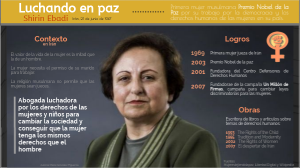 Primera mujer jueza de IránPremio Nobel de la paz Fundadora del Centro Defensores de Derechos Humanos Fundadorae de la campaña Un Millón de Firmas, campaña para cambiar leyes discriminatorias para las mujeres.