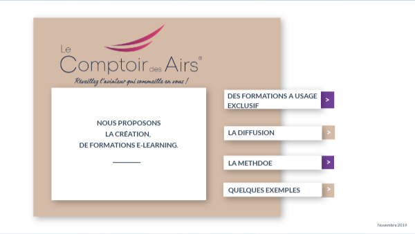 Nous vous proposons des formations e-Learning 100 % personnalisées et à usage exclusif. Création de scénarios en lien avec les experts aéroportuaire et du domaine professionnel concerné Des designs créés pour vous, à vos couleurs et selon vos souhaits. Des modules e-Learning épurés, modernes, interactifs et pédagogiques pour une cohérence de style Des animations modernes, nous utilisons les dernières technologies et des outils comme gomo , génially, powtoon. Pas de compte d'apothicaire, des voix off illimitées, pas de comptabilisation du nombre d'écran ou de durée des vidéos.