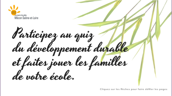 Dans le cadre du projet « Mon école E3D » dans lequel vous êtes inscrits, vous avez la possibilité de participer avec votre classe au quiz du développement durable. Ce quiz a pour but de faire jouer les familles des écoles participantes.