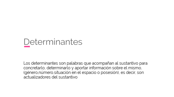 Los determinantes son palabras que acompañan al sustantivo para concretarlo, determinarlo y aportar información sobre el mismo, (género,número,situación en el espacio o posesión), es decir, son actualizadores del sustantivo
