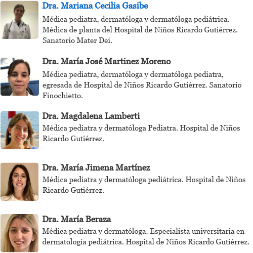 Médica pediatra y dermatóloga. Especialista universitaria en dermatología pediátrica. Hospital de Niños Ricardo Gutiérrez.