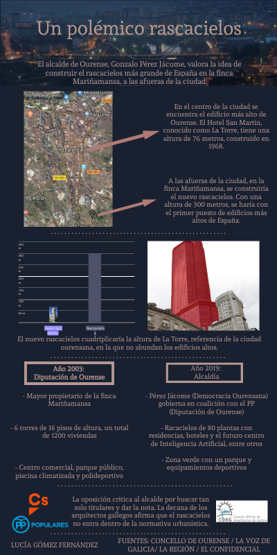 - Pérez Jácome (Democracia Ourensana) gobierna en coalición con el PP (Diputación de Ourense) - Racacielos de 80 plantas con residencias, hoteles y el futuro centro de Inteligencia Artificial, entre otros - Zona verde con un parque y equipamientos deportivos