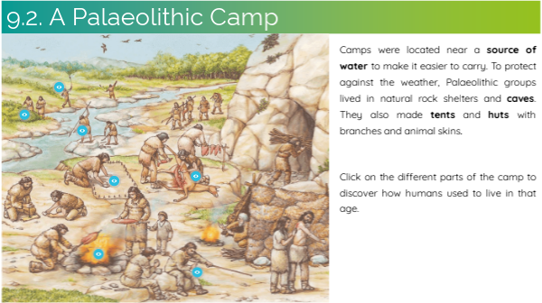 Click on the different parts of the camp to discover how humans used to live in that age.