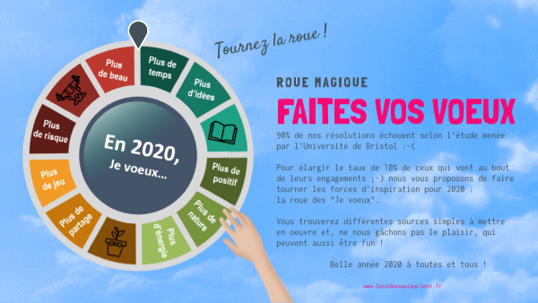 90% de nos résolutions échouent selon l'étude menée par l'Université de Bristol :-(Pour élargir le taux de 10% de ceux qui vont au bout de leurs engagements ;-) nous vous proposons de faire tourner les forces d'inspiration pour 2020 : la roue des "Je voeux".Vous trouverez différentes sources simples à mettre en oeuvre et, ne nous gâchons pas le plaisir, qui peuvent aussi être fun ! Belle année 2020 à toutes et tous !w