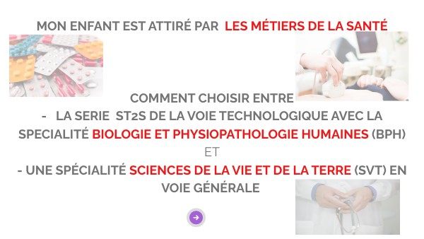 Mon enfant est attiré par les métiers de la santé Comment choisir entre - la serie ST2S de la voie technologique avec la specialité BIOLOGIE ET PHYSIOPATHOLOGIE HUMAINEs (BPH) ET - une spécialité SCIENCES DE LA VIE ET DE LA TERRE (SVT) en VOie générale