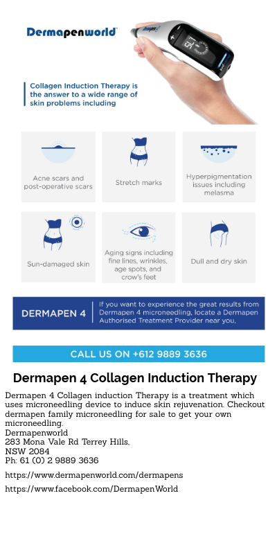 Dermapen 4 Collagen induction Therapy is a treatment which uses microneedling device to induce skin rejuvenation. Checkout dermapen family microneedling for sale to get your own microneedling. Dermapenworld 283 Mona Vale Rd Terrey Hills, NSW 2084 Ph: 61 (0) 2 9889 3636