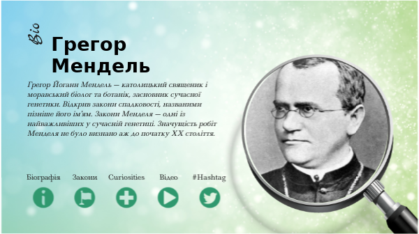 Грегор Йоганн Мендель — католицький священик і моравський біолог та ботанік, засновник сучасної генетики. Відкрив закони спадковості, названими пізніше його ім'ям. Закони Менделя — одні із найважливіших у сучасній генетиці. Значущість робіт Менделя не було визнано аж до початку XX століття.