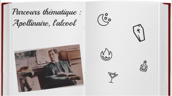 Le théme de l''alcool est abordé à maintes reprises dans le recueil. Alcools est d'ailleurs le titre de ce dernier, pour dire l'imprtance du sujet. Apollinaire décrit le plus souvent l'alcool comme une chose dangereuse et déstructrice qui prend aux gens tout ce qu'ils ont. Mais parfois dans le recueil, l'alcool est décrit comme un moyen de se libérer de ses souffrances, un moyen d'oublier les difficultés de la vie ou tout simplement un moyen de faire la fete. On sent que la relation qu'entretient Apollinaire avec l'alcool est ambigue et que même lui ne sait pas si'l l'aime ou le deteste.