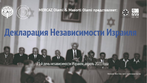 Поэтому собрались мы, , представители еврейского населения страны и сионистского движения, в день окончания британского мандата на Эрец-Исраэль, и в силу нашего естественного и исторического права, а также на основании решения Генеральной Ассамблеи ООН настоящим мы провозглашаем создание Еврейского Государства в Эрец-Исраэль -
