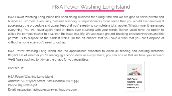 H&A Power Washing Long Island has been doing business for a long time and we are glad to serve private and business customers. Eventually, pressure washing is unquestionably more useful than you would ever envision. It accelerates the procedure and guarantees that you're ready to complete a lot snappier. What's more, it rearranges everything. You will never again need to stress over cleaning with your hands. Rather, you'll have the option to utilize the compel washer to deal with the issue in a jiffy. We approach ground-breaking pressure washers and this permits us to dispose of the hardest stains. On the off chance that you have a stain that you can't dispose of without anyone else, you'll need to call us. H&A Power Washing Long Island has the apparatuses expected to clean all fencing and decking materials. Regardless of whether you're managing a wood deck or a vinyl fence, you can ensure that we have you secured. We'll figure out how to tidy up the chaos for you regardless. Contact Us:H&A Power Washing Long IslandAddress: 2427 Hysler Street, East Meadow, NY 11554Phone: (631) 212-1462Email: nassau@amazingpressurewashingguys.com