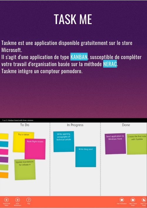 Taskme est une application disponible gratuitement sur le store Microsoft.Il s'agit d'une application de type KANBAN, susceptible de compléter votre travail d'organisation basée sur la méthode NERAC.Taskme intègre un compteur pomodoro.