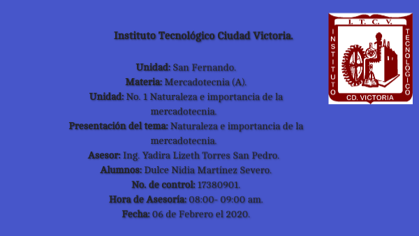 Unidad: San Fernando.Materia: Mercadotecnia (A). Unidad: No. 1 Naturaleza e importancia de la mercadotecnia. Presentación del tema: Naturaleza e importancia de la mercadotecnia. Asesor: Ing. Yadira Lizeth Torres San Pedro. Alumnos: Dulce Nidia Martínez Severo. No. de control: 17380901. Hora de Asesoría: 08:00- 09:00 am. Fecha: 06 de Febrero el 2020.